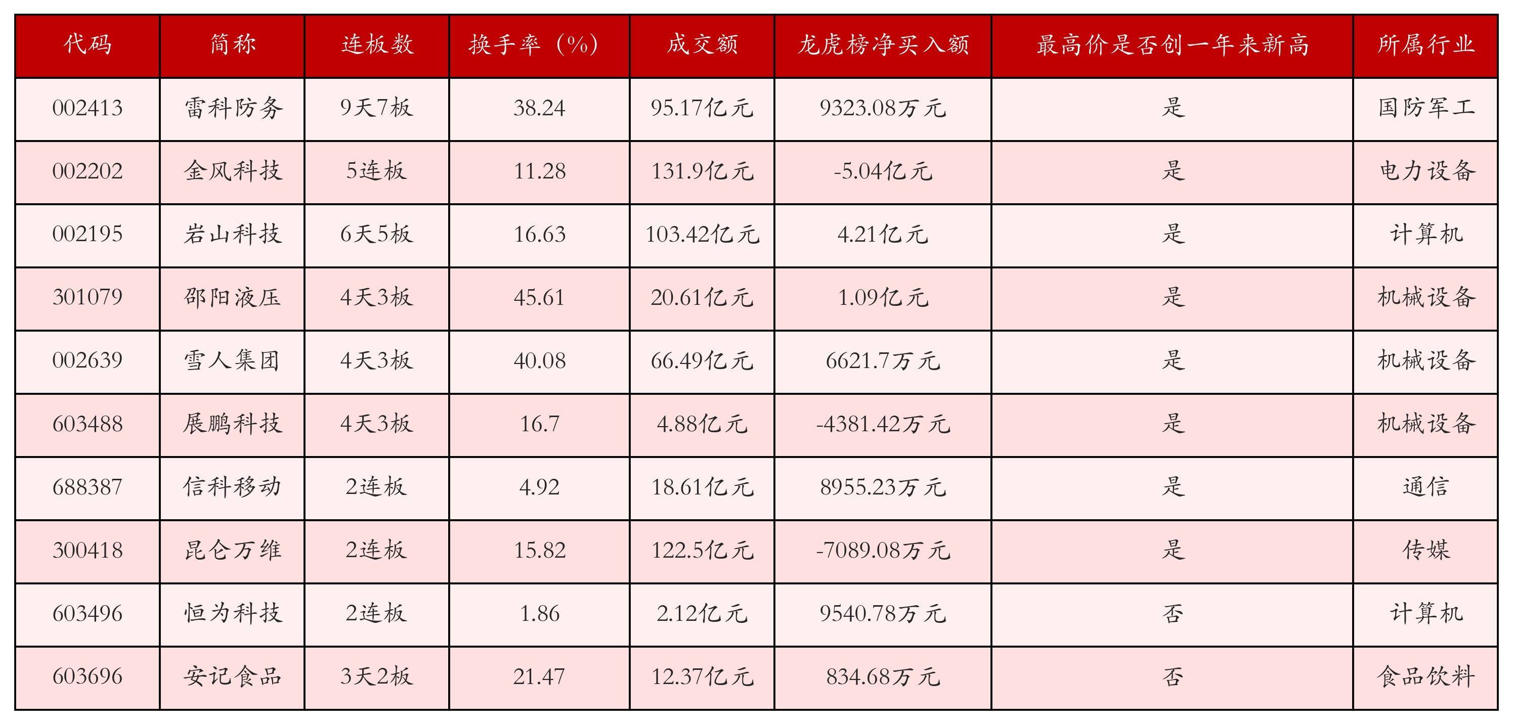 截至1月12日收盘,上证综指上涨1.09%,收于4165.29点,深证成指上涨1.75%,收于14366.91点,创业板指上涨1.82%,收于3388.34点。今日沪深两市A股共计197只涨停,综合当前连板数以及当日龙虎榜数据,其中较为强势的前三只个股分别为:雷科防务(002413)、金风科技(002202)与岩山科技(002195)。今日强势个股前10位具体数据见下表: