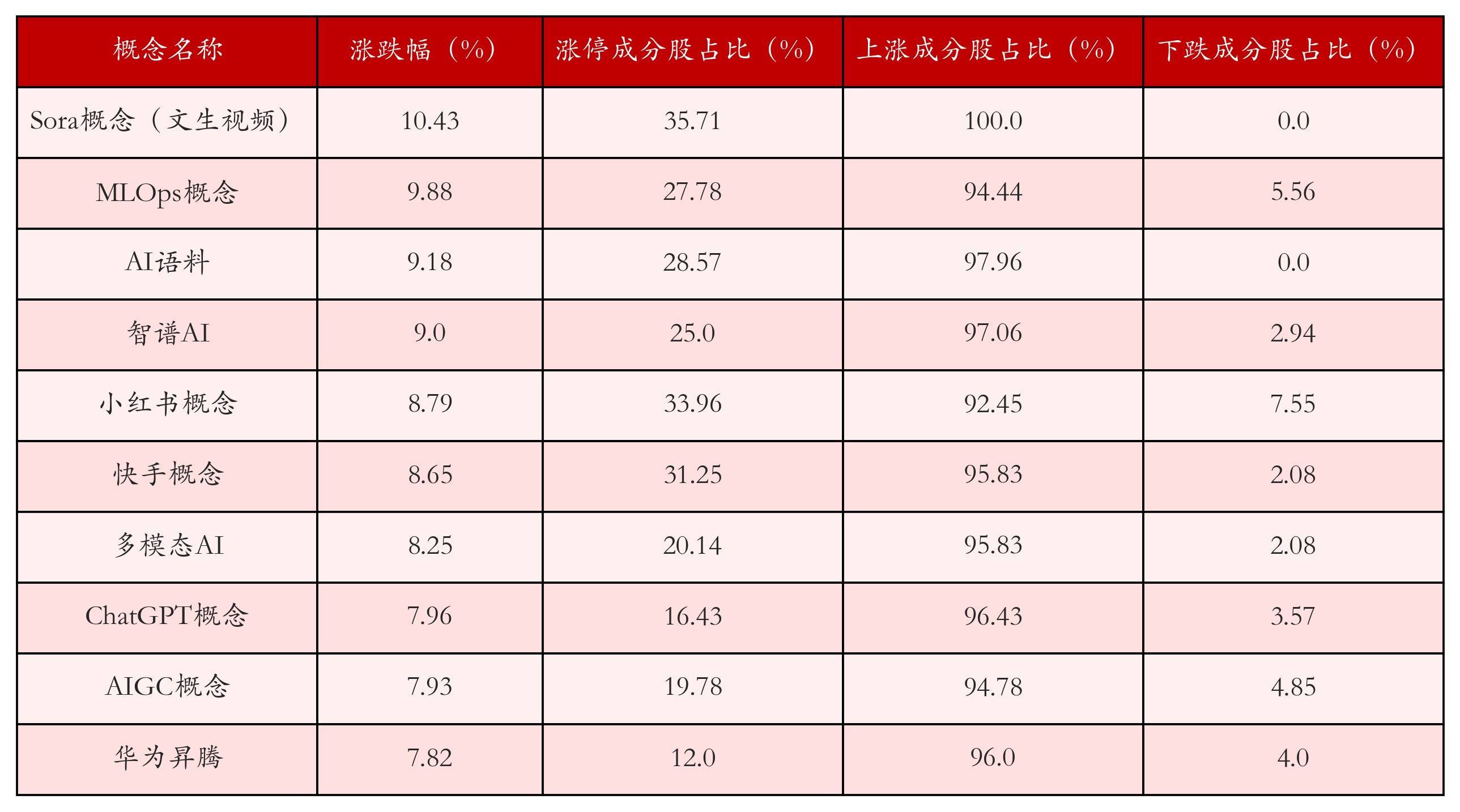 根据A股概念涨跌幅与所对应的股票池综合分析,涨幅靠前的三个概念板块分别为:Sora概念(文生视频)、MLOps概念与AI语料。排名前10位的概念板块相关数据见下表: